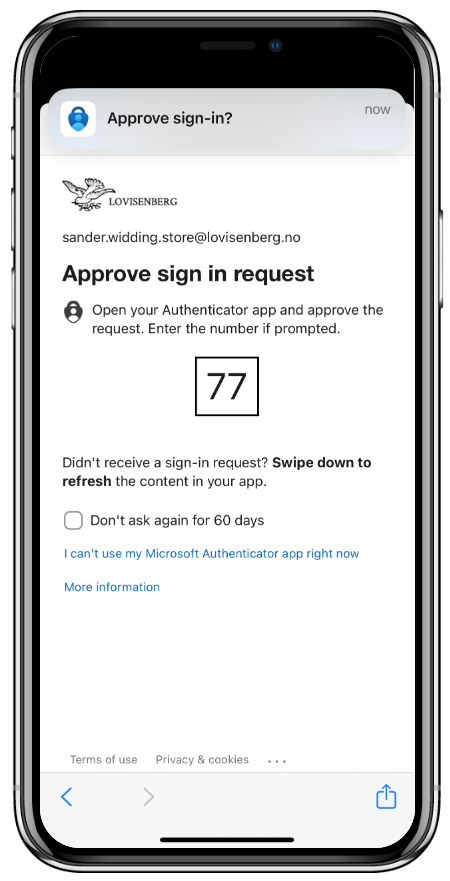 Steg 6: Etter du har skrevet inn passord vil det se slik ut. Tallet som kommer opp, skal du skrive inn i Authenticator-appen for å bekrefte innlogging. Trykk på fanen/varslingen som kommer opp øverst på skjermen, og du vil bli omdirigert til appen «Microsoft Authenticator» for to-faktor autentisering.